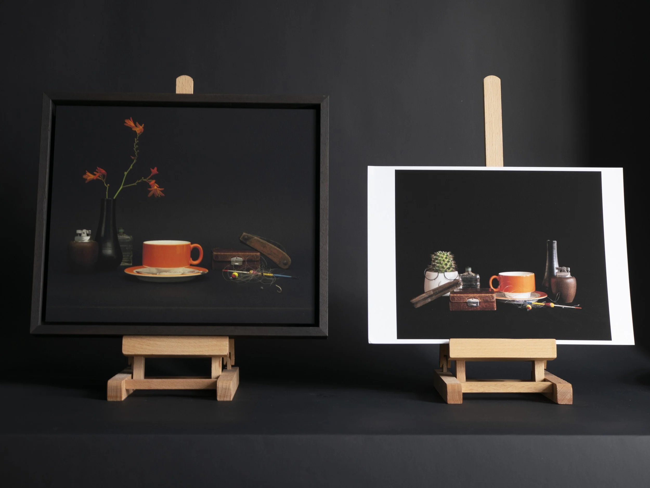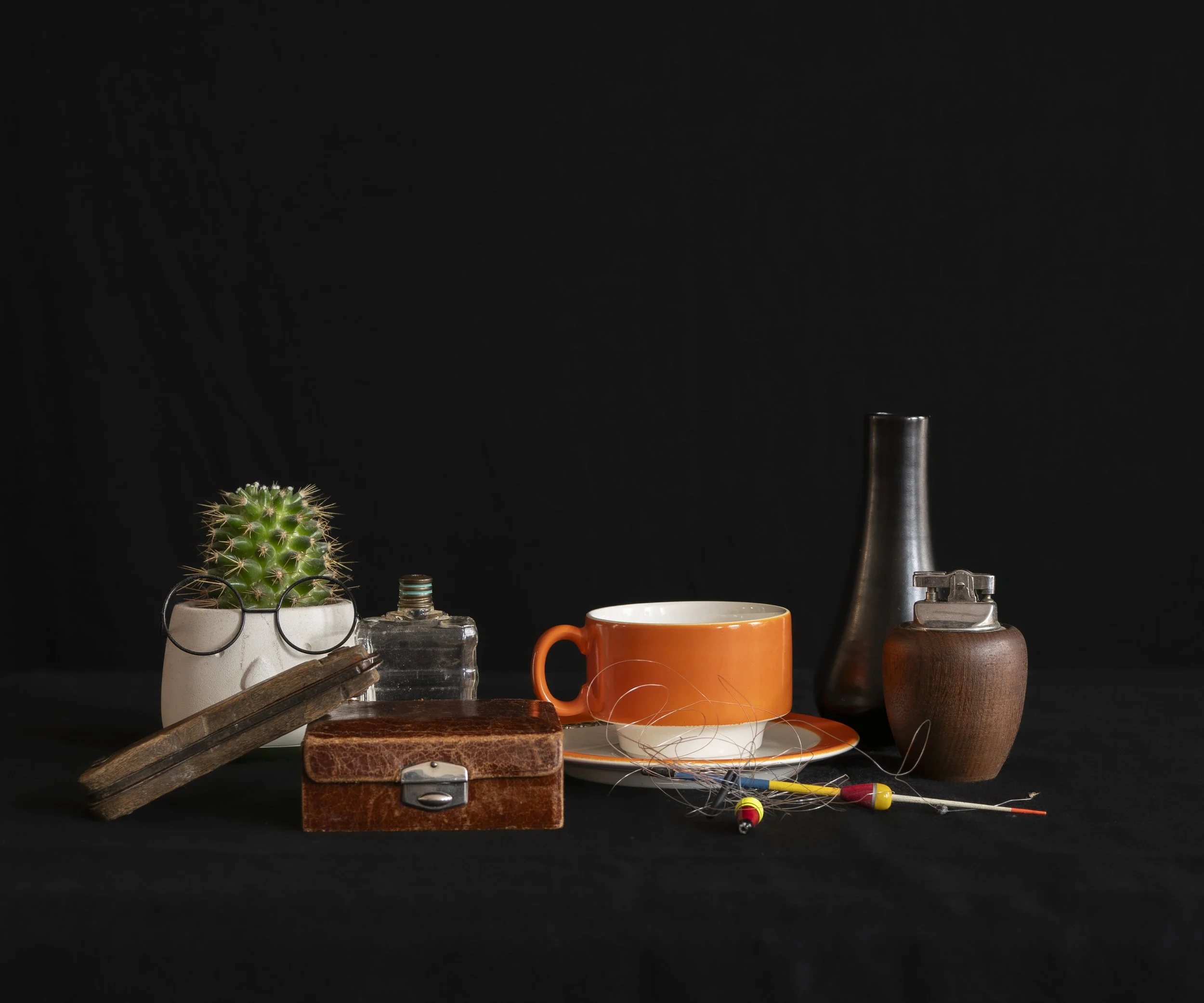 Eén voor één houd ik de spullen uit mijn stilleven Oranje Pagnossin kop en schotel omhoog.