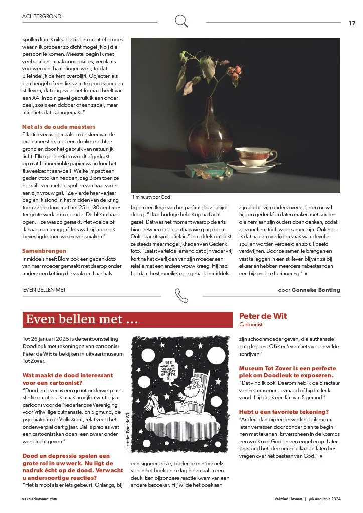 Het was spannend, maar vooral geweldig om met mijn kersverse bedrijf zo snel al in een vakblad over de uitvaartbranche te staan. Hierdoor werd mijn werk zichtbaar voor proffesionals uit de branche. Ik had al diverse uitvaartondernemers benaderd, bezocht met een ingelijst Stillevend, visitekaartjes en portfolio. Daarbij ontdekte ik hoe druk deze mensen het hebben.